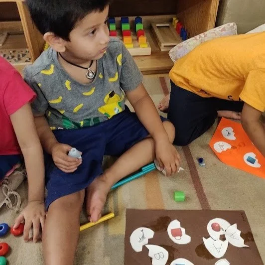 The children came to the table by themselves and waited for the activity to begin. Initially, the children took the worksheets and gluesticks. They said what they observed in their worksheets. After that, by practicing the sounds of each letter, they said which alphabet the objects begin with. One by one, they tried to find the letters from the cutouts kept in a bowl and stuck it on the worksheets to finish their puzzle. All the children seemed quite engaged and everyone was able to finish the activity. After the activity got over, all the children helped in cleanup.