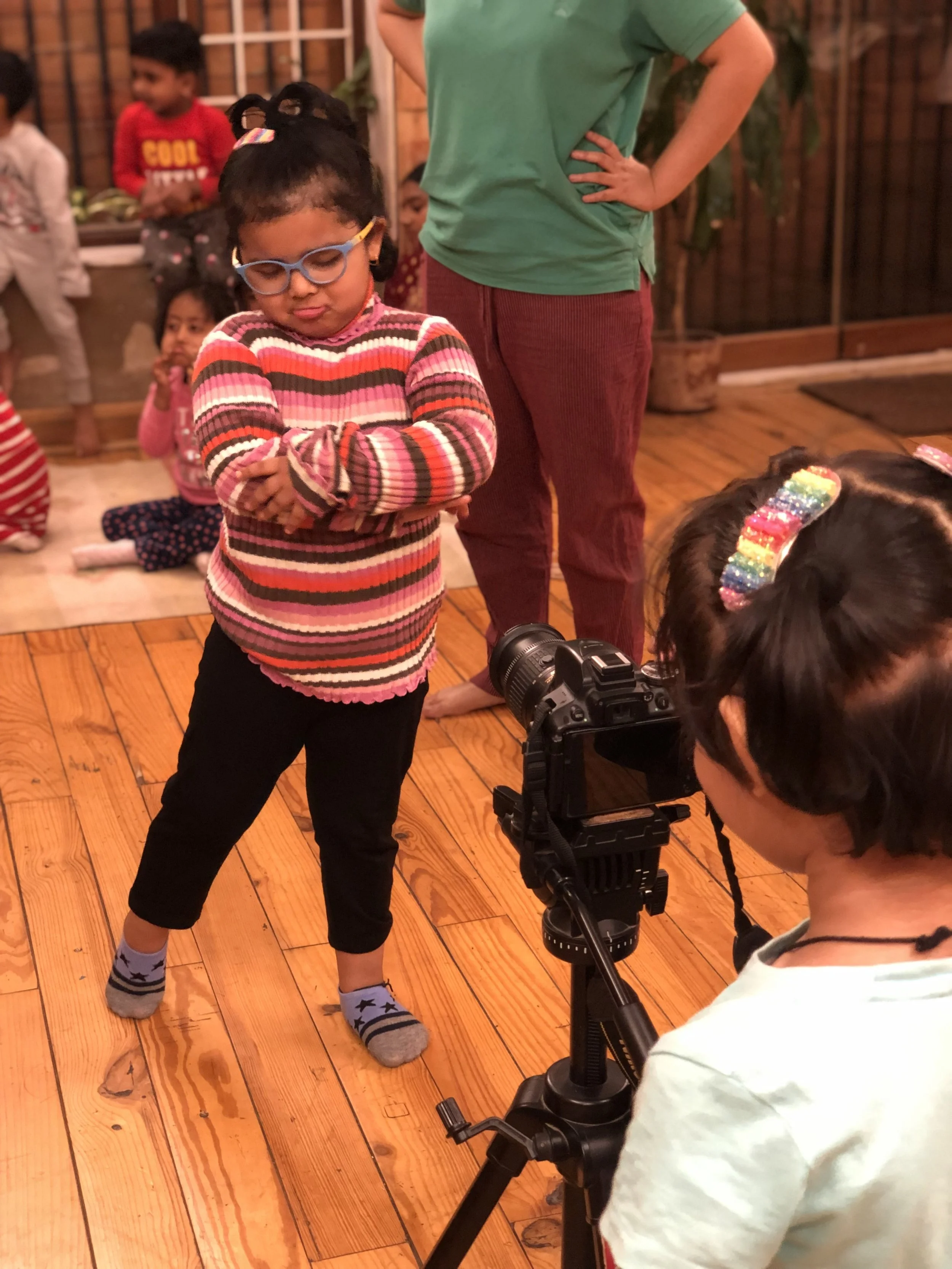 Learning Photography with Samir Bhaiya: The children gathered in the cubby area, where they were greeted by Samir Bhaiya and his camera. Here, the Arthlings were treated to a live demonstration of how a DSLR camera works. Samir Bhaiya showed them how to take a photo by half-pressing the shutter button, which made a click sound. He also used his viewfinder screen to demonstrate the zoom feature. Finally, the children observed a live view of themselves on the camera display!