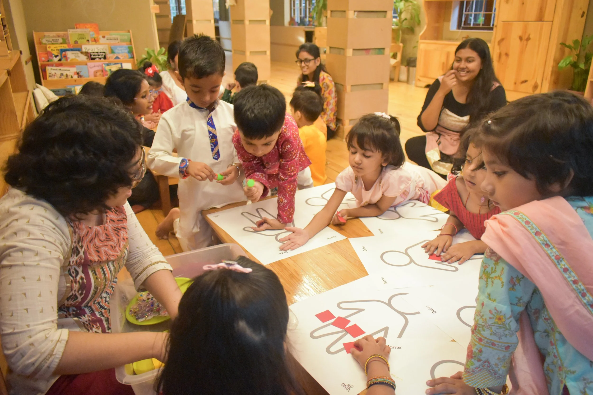 The children arrived in all kinds of colourful ethnic outfits representing their backgrounds! Ayansh wore a traditional yellow suit which he accessorized with a matching ‘pagdi’ and moustache! Sharlav wore a multicoloured kurta and a red velvet ‘topi’ inherited from his great grandfather! Maryam wore shararas in pink and green. Shanaaya wore a bright magenta salwar-kameez. Even the facilitators dressed for the occasion.