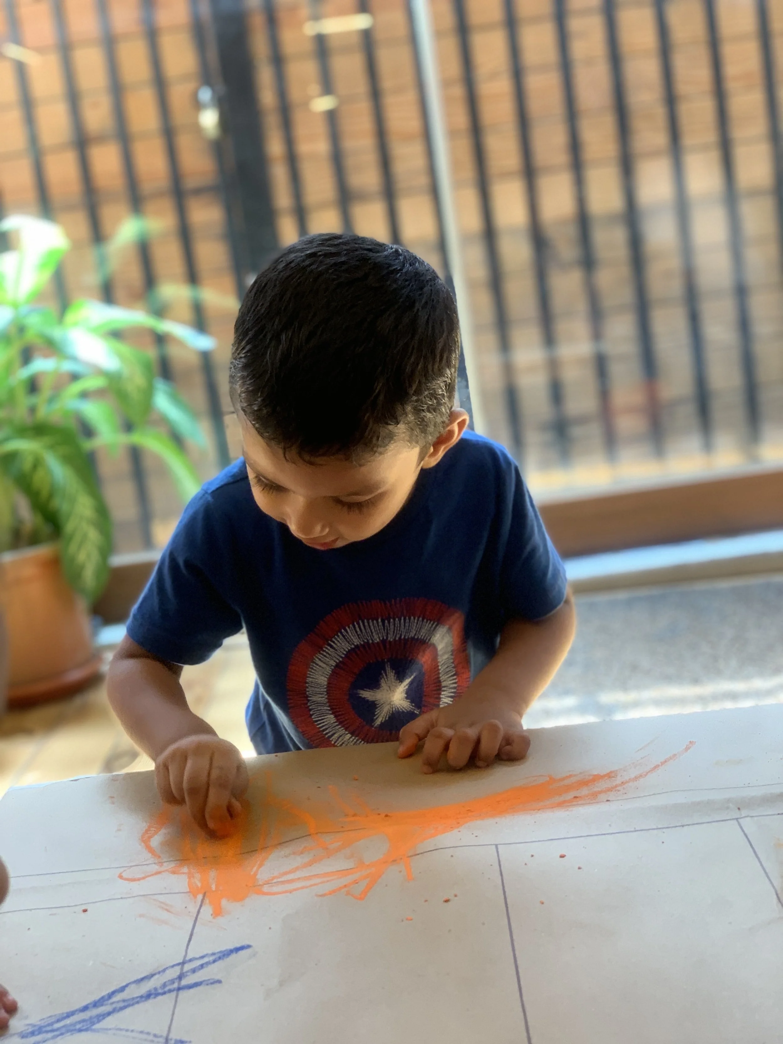 Work-time: It included coloring the national flag, the outline of which was drawn on a canvas and pasted on a small table. The kids were presented with five shades (Orange, white, green, blue and brown). Soft pastels were used and it seemed like the kids enjoyed smudging these colors using their fingers. Aayansh was able to recognise each color correctly. Atharv Goyal spent most of his time smudging the colors over the floor. Yasha made mini circular scribbles over the canvas while Saanvi preferred to move the color in straight smooth lines. Ratujit and Krishay helped the facilitator clean-up after the activity.