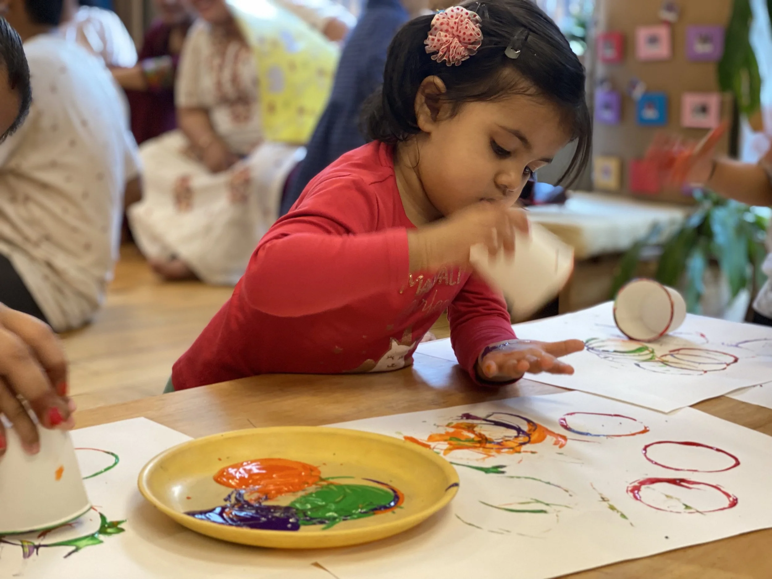 At first, the children responded by imitating the facilitator as the activity was demonstrated. It was observed that the children were intrigued by the process of the activity - paints on the rim of the cup and the marks that the cup made on the paper. The activity also transformed into different endeavours, like hand printing. Kiaan made handprints on the paper and labelled them as a butterfly. Ivanshi was just enjoying the act of putting her hands in the paint and stamping it onto the paper.