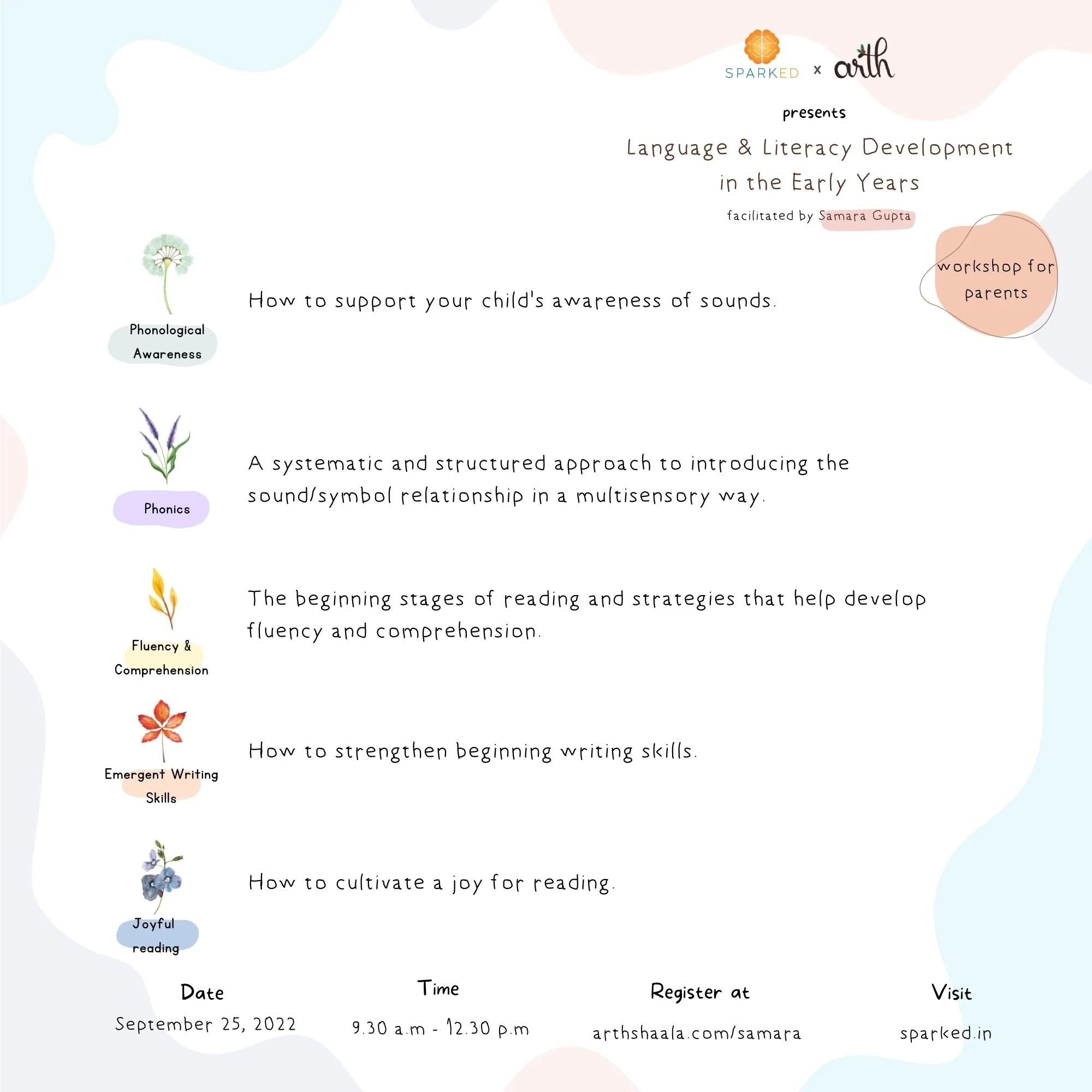 Finally, to honour your requests, we reached out to Samara, our mentor, an ace educator, a reading specialist, the founder of SparkEd, and so much more, to help us. She agreed to travel to Kolkata for a weekend and take a 3-hour session exclusively for parents of arth. We’ll tell you more about Samara and the workshop in a bit. But before that, the details regarding the workshop.